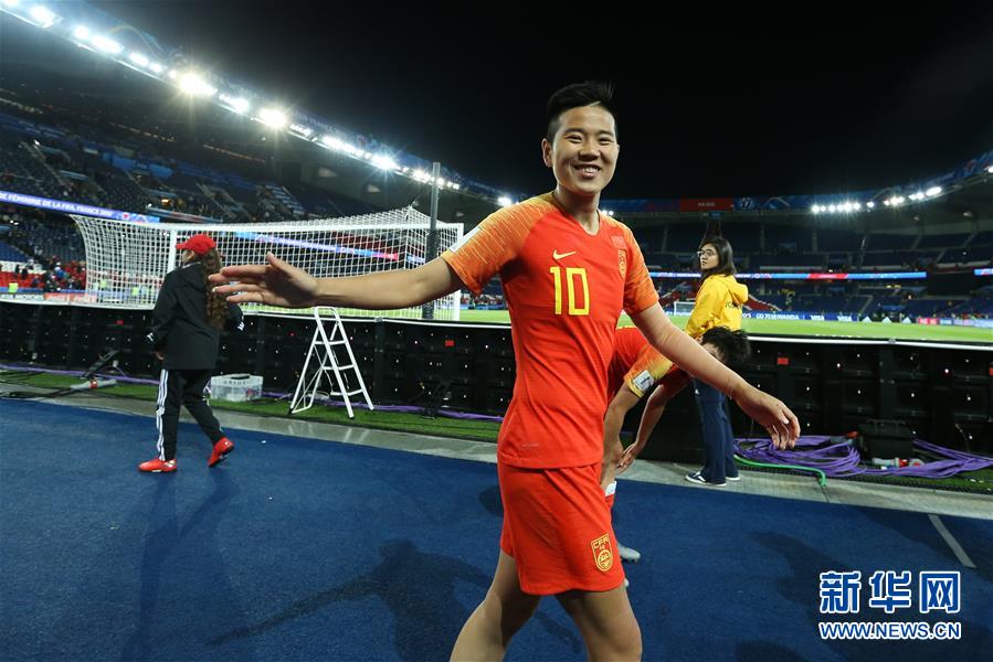 6月13日,中国队球员李影在赛后庆祝胜利。 当日,在法国巴黎举行的2019年国际足联女足世界杯B组小组赛中,中国队以1比0战胜南非队。 新华社记者 郑焕松 摄
