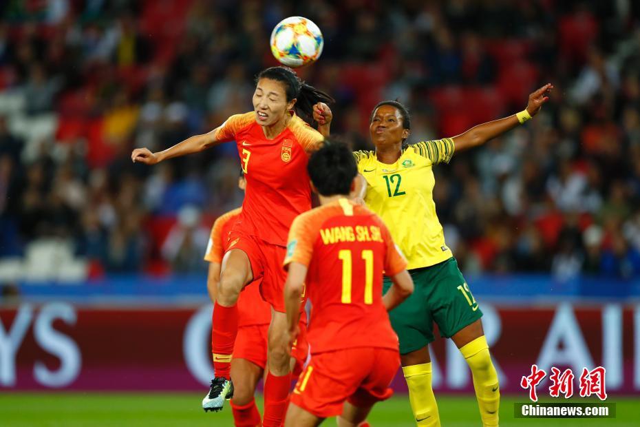 当地时间6月13日,中国队球员林宇萍(左)在比赛中争顶头球。当日,在法国巴黎举行的2019年国际足联女足世界杯B组小组赛中,中国队以1比0战胜南非队。中新社记者 富田 摄