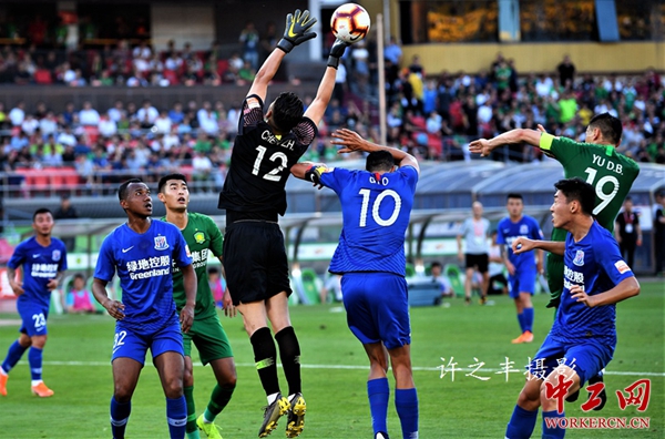 2019年6月14日晚,中超联赛第13轮比赛,北京中赫国安主场2比1战胜上海绿地申花,国安取得主场对申花的联赛10连胜。比赛第14分钟,国安队朴成低射破门;第41分钟,国安队奥古斯托远射破门;第90分钟,申花在任意球攻势中由吴毅臻扳回一球。图为双方的比赛。工人日报-中工网许之丰摄影报道