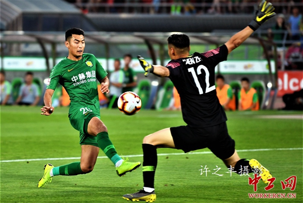 2019年6月14日晚,中超联赛第13轮比赛,北京中赫国安主场2比1战胜上海绿地申花,国安取得主场对申花的联赛10连胜。比赛第14分钟,国安队朴成低射破门;第41分钟,国安队奥古斯托远射破门;第90分钟,申花在任意球攻势中由吴毅臻扳回一球。图为双方的比赛。工人日报-中工网许之丰摄影报道