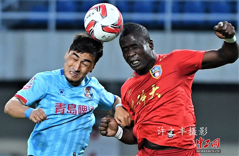 2019年6月15日晚,中甲联赛第13轮比赛,北京北体大队主场迎战领头羊青岛黄海队。比赛开始第3分钟,青岛队王栋利用任意球率先得分。第30分钟,北体大队林斯远射将比分扳平。第58分钟,北体大队戈武禁区内劲射反超比分。第83分钟,北体大队王建文再下入一球。最终北京北体大队主场以3比1击败中甲领头羊青岛黄海队。图为双方的比赛瞬间。工人日报-中工网许之丰摄影报道