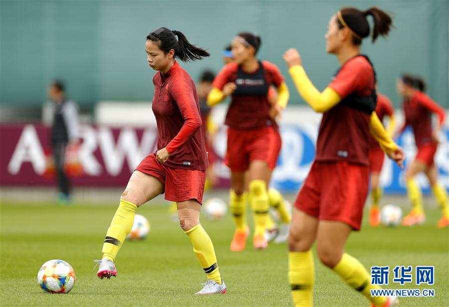 6月15日,中国队队员谭茹殷(左)在训练中。 当日,中国女足在法国勒阿弗尔训练,备战2019年国际足联女足世界杯B组小组赛对阵西班牙队的比赛。 新华社记者丁旭摄