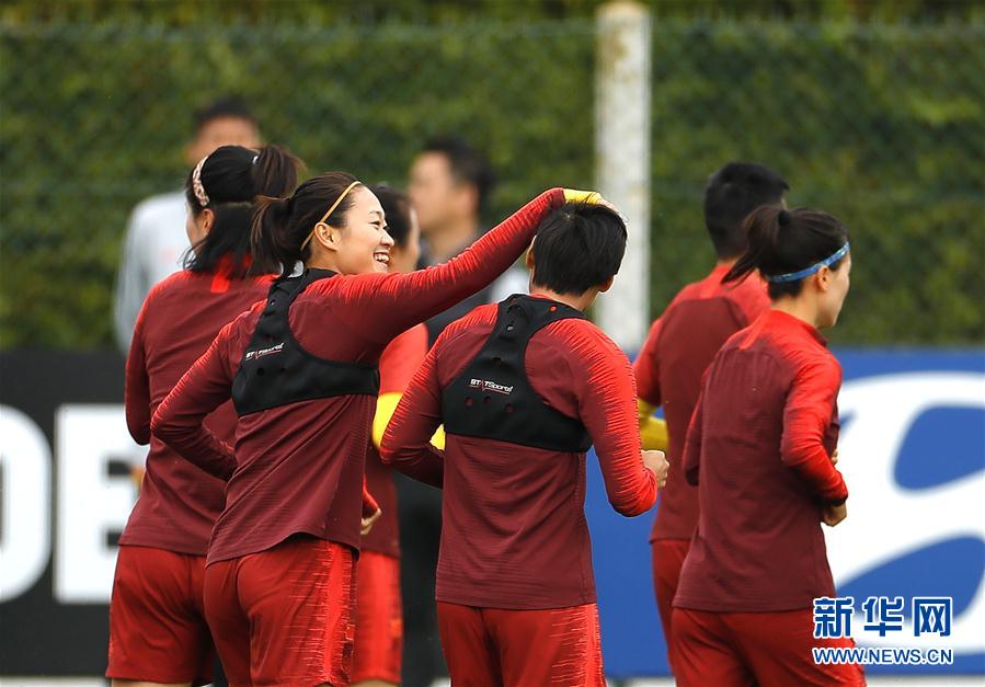 6月15日,中国队队员吴海燕(前左)与队友韩鹏在训练中。 当日,中国女足在法国勒阿弗尔训练,备战2019年国际足联女足世界杯B组小组赛对阵西班牙队的比赛。 新华社记者丁旭摄