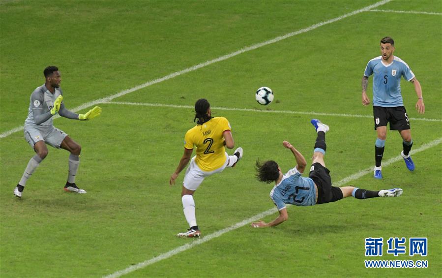 6月16日,乌拉圭队球员卡瓦尼(右二)比赛中射门得分。 当日,在贝洛奥利藏特进行的美洲杯足球赛C组小组赛中,乌拉圭队以4比0战胜厄瓜多尔队。 新华社/路透
