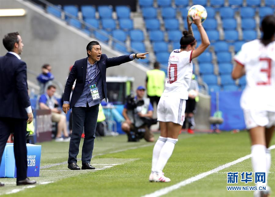 6月17日,中国队主教练贾秀全(左二)在场边指挥。 当日,在法国勒阿弗尔举行的2019年国际足联女足世界杯B组小组赛中,中国队以0比0战平西班牙队,与西班牙队携手出线。 新华社记者 丁旭 摄