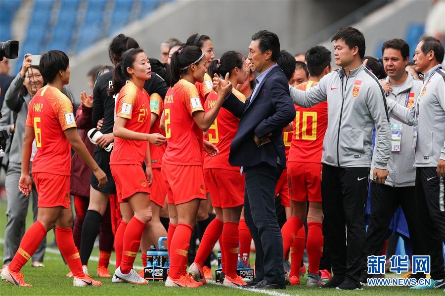 6月17日,中国队主教练贾秀全(中右)在赛后与队员庆祝。 当日,在法国勒阿弗尔举行的2019年国际足联女足世界杯B组小组赛中,中国队以0比0战平西班牙队,与西班牙队携手出线。 新华社记者郑焕松 摄