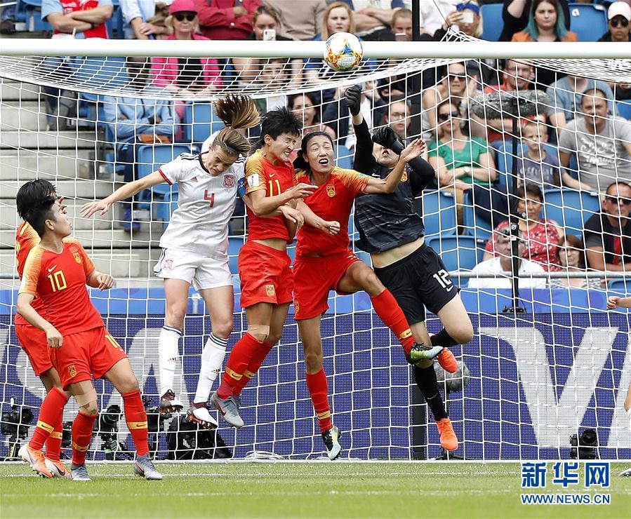 6月17日,中国队守门员彭诗梦(右一)在比赛中出击救险。 当日,在法国勒阿弗尔举行的2019年国际足联女足世界杯B组小组赛中,中国队以0比0战平西班牙队,与西班牙队携手出线。 新华社记者 丁旭 摄