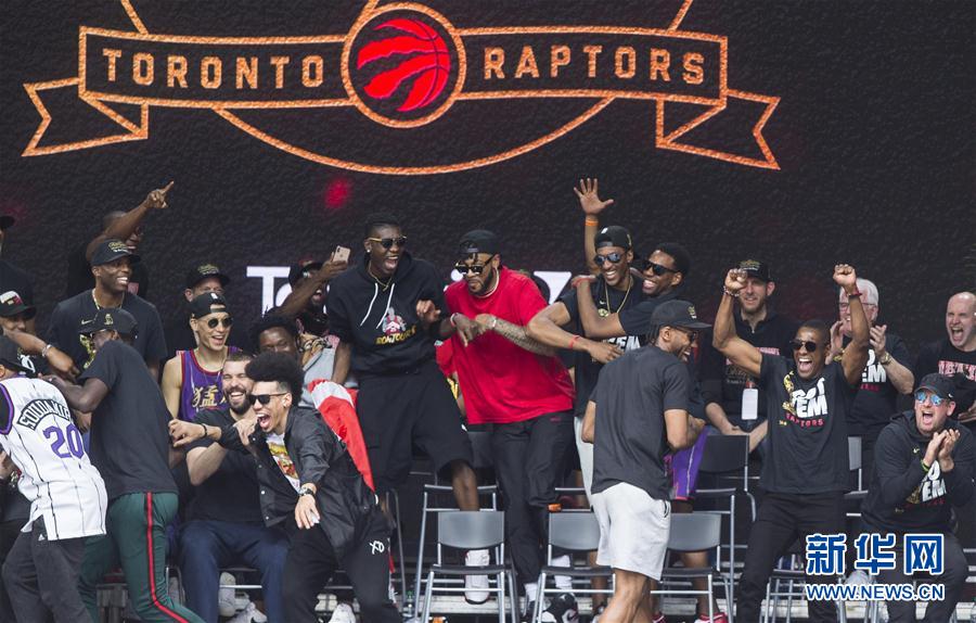 6月17日,在加拿大多伦多,猛龙队球员在庆祝活动中。 当日,加拿大多伦多为夺得本赛季NBA总冠军的猛龙队举行夺冠游行及集会庆祝活动,吸引了上百万市民沿途围观。在NBA2018-2019赛季总决赛中,多伦多猛龙队以4比2击败金州勇士队,夺得球队历史上首个NBA总冠军。 新华社发(邹峥摄)