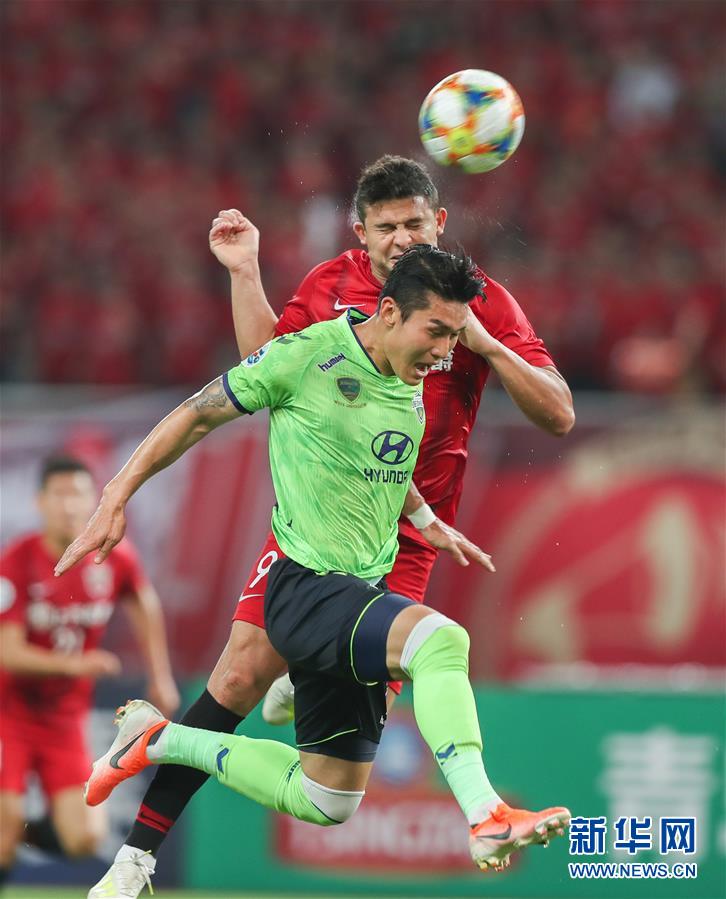 6月19日,上海上港队球员埃尔克森(后)在比赛中争顶。 当日,在2019年亚冠联赛八分之一决赛首回合比赛中,中超上海上港队主场以1比1战平韩国全北现代队。 新华社记者丁汀摄