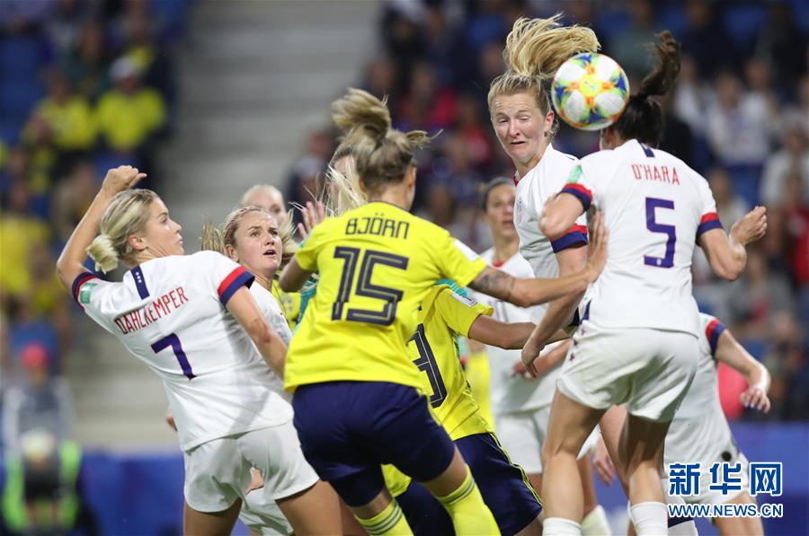 6月20日,美国队球员在比赛中与瑞典队球员在禁区内争顶。 当日,在法国勒阿弗尔举行的2019年国际足联女足世界杯F组小组赛中,美国队以2比0战胜瑞典队,分别以小组第一、第二名的成绩晋级16强。 新华社记者程婷婷摄