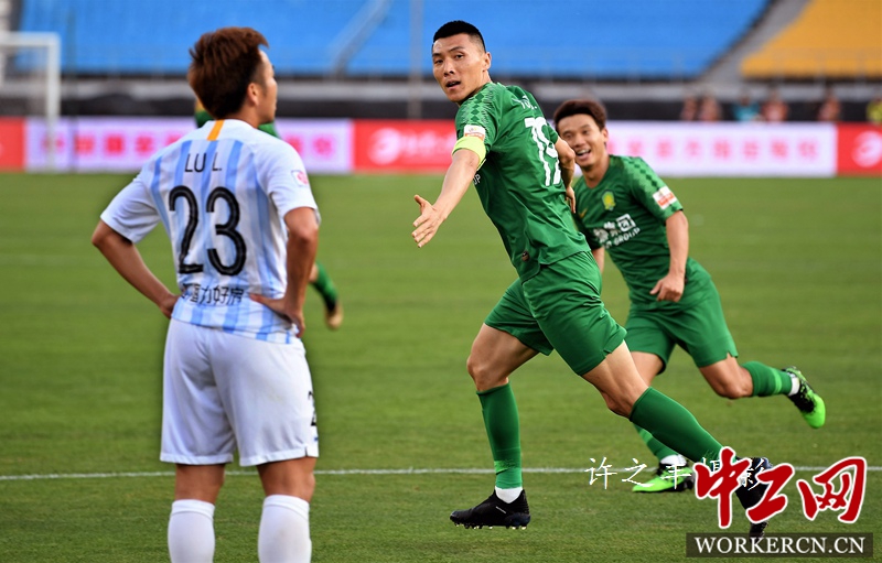 2019年6月22日晚,中超联赛第14轮比赛,北京中赫国安3比2广州富力。比赛第5分钟,国安队王刚助功王子铭入球;第19分钟,富力队扎哈维禁区内前插时被于大宝绊倒,主裁判马宁在视频裁判提醒下判定点球,扎哈维主罚点球命中;第36分钟,卢琳再次为富力赢得点球,扎哈维点球梅开二度;第54分钟,国安队于大宝头球破门扳平;补时第4分钟,国安队奥古斯托以精彩弧线打入绝杀球。图为双方的比赛瞬间。工人日报-中工网许之丰摄影报道
