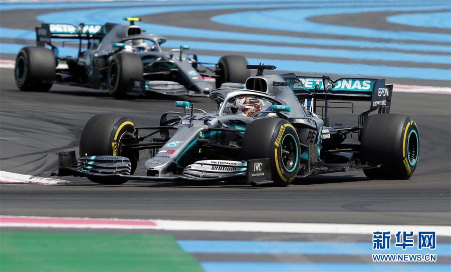 6月23日,梅赛德斯车队车手汉密尔顿(前)驾驶赛车在比赛中。 当日,在法国勒卡斯泰莱举行的2019年世界一级方程式赛车锦标赛(F1)大奖赛法国站比赛中,梅赛德斯车队车手汉密尔顿以1小时24分31秒198的成绩夺得冠军。 新华社/路透