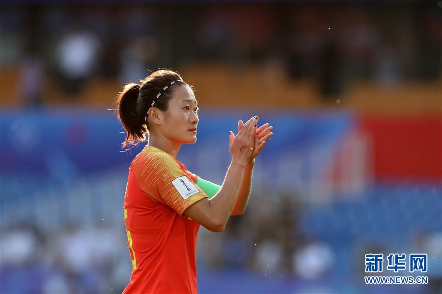 6月25日,中国队球员吴海燕在比赛后向观众致意。 当日,在法国蒙彼利埃举行的2019年国际足联女足世界杯16强赛比赛中,中国队以0比2负于意大利队,无缘八强。 新华社记者 徐子鉴 摄