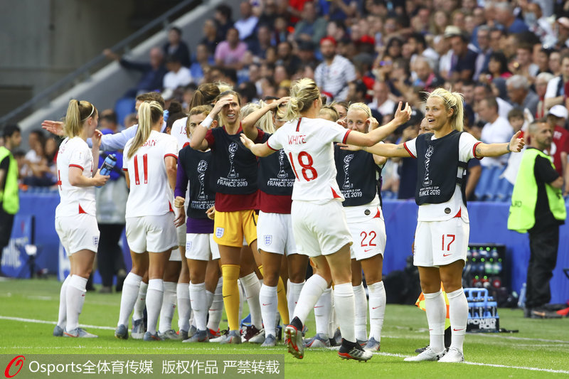 人民网北京6月28日电 北京时间今天凌晨三点,2019年国际足联女足世界杯1/4决赛第一场挪威和英格兰队之间的比赛,在勒阿弗尔的海洋球场正式开始,上半场刚开始127秒,英格兰队右后卫布隆泽突破传球,斯科特推射得分。第40分钟布隆泽做球,帕里什带球切入禁区横传,怀特推射再下一城。第56分钟布隆泽自己拼出任意球机会,米德主罚推传中路,布隆泽中路劲射打进第三球。最终英格兰队3比0大胜挪威,杀入四强。