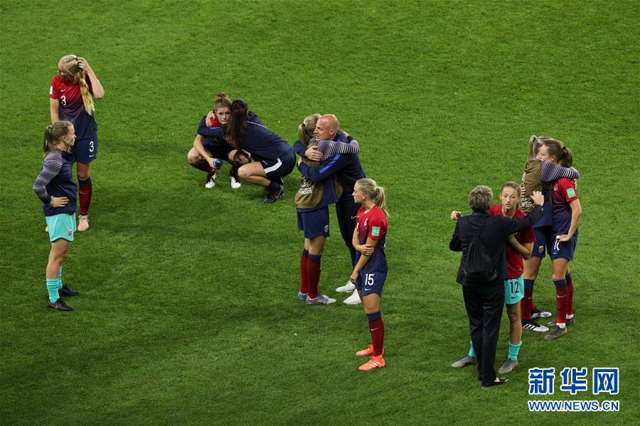 6月27日,挪威队教练组成员在赛后安慰球员。 当日,在法国勒阿弗尔举行的2019年国际足联女足世界杯四分之一决赛中,英格兰队以3比0战胜挪威队,晋级四强。 新华社记者郑焕松摄