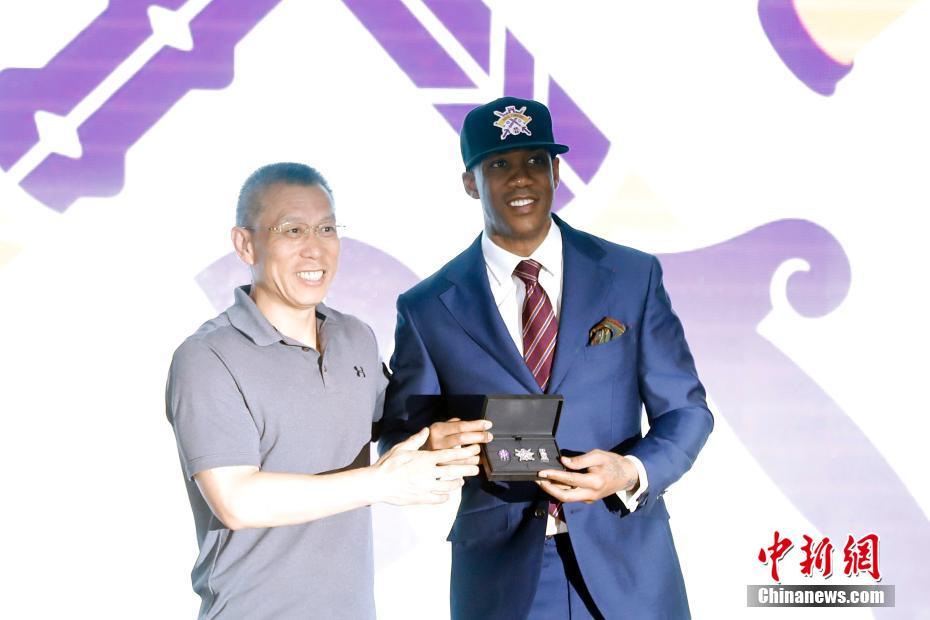 6月28日下午,北京控股篮球俱乐部在北京举行主教练马布里见面会,图为北控男篮新任主教练马布里获赠纪念章。 中新社记者 韩海丹 摄