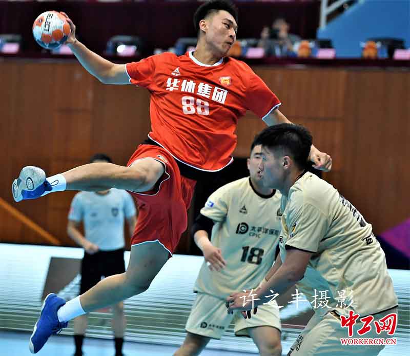 2019年6月28日晚,2019中国男子手球超级联赛在北京光彩体育馆打响,在揭幕战中,华体国家男子手球俱乐部以33比26战胜太平洋保险江苏男子手球俱乐部。华体集团成为了中国国家男子手球俱乐部的冠名赞助商。中国华体队王军程与江苏队赵楠一同当选本场比赛的MVP球员。图为双方的比赛瞬间。工人日报-中工网许之丰摄影报道