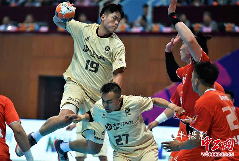 2019年6月28日晚,2019中国男子手球超级联赛在北京光彩体育馆打响,在揭幕战中,华体国家男子手球俱乐部以33比26战胜太平洋保险江苏男子手球俱乐部。华体集团成为了中国国家男子手球俱乐部的冠名赞助商。中国华体队王军程与江苏队赵楠一同当选本场比赛的MVP球员。图为双方的比赛瞬间。工人日报-中工网许之丰摄影报道