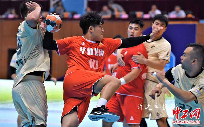 2019年6月28日晚,2019中国男子手球超级联赛在北京光彩体育馆打响,在揭幕战中,华体国家男子手球俱乐部以33比26战胜太平洋保险江苏男子手球俱乐部。华体集团成为了中国国家男子手球俱乐部的冠名赞助商。中国华体队王军程与江苏队赵楠一同当选本场比赛的MVP球员。图为双方的比赛瞬间。工人日报-中工网许之丰摄影报道