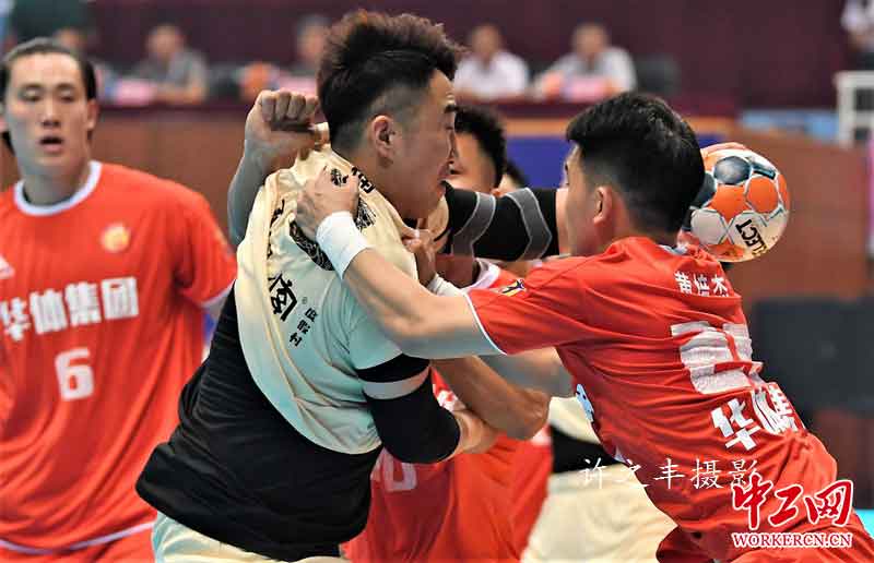 2019年6月28日晚,2019中国男子手球超级联赛在北京光彩体育馆打响,在揭幕战中,华体国家男子手球俱乐部以33比26战胜太平洋保险江苏男子手球俱乐部。华体集团成为了中国国家男子手球俱乐部的冠名赞助商。中国华体队王军程与江苏队赵楠一同当选本场比赛的MVP球员。图为双方的比赛瞬间。工人日报-中工网许之丰摄影报道
