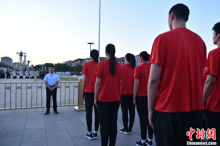 7月1日,七一建党节,中国篮球协会开展“祖国在我心中”,“不忘初心、牢记使命”主题教育活动,组织全体党员干部及中国国家女篮、国奥男篮运动员、教练员(约75人),在天安门广场观看升旗仪式。中新网记者 李骏 摄