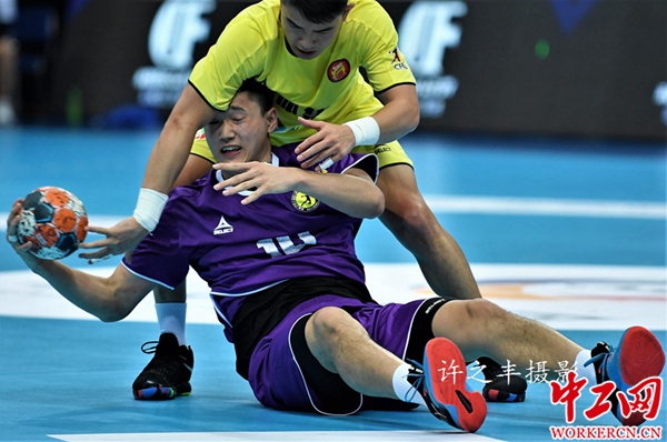 6月30日,2019中国男子手球超级联赛北京分站赛最后一个比赛日,在一场决定冠军归属的焦点战中,华体国家男子手球俱乐部以40比27战胜广东路环四庙男子手球俱乐部,从而以三战全胜的成绩,夺得北京站的冠军,北京队获亚军,江苏队和广东队分列三四名。图为国家队与广东队的比赛瞬间。工人日报-中工网许之丰摄影报道