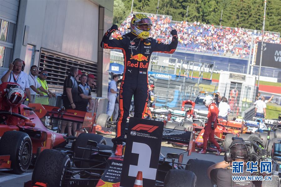 6月30日,维斯塔潘在终点庆祝胜利。 当日,在奥地利施皮尔贝格红牛赛道举行的2019世界一级方程式赛车锦标赛(F1)奥地利大奖赛中,红牛车队车手维斯塔潘夺得冠军。 新华社记者郭晨摄