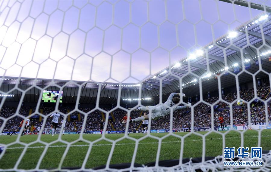 6月30日,西班牙队球员法比安·鲁伊斯打入进球。 当日,在意大利乌迪内举行的欧洲U21青年足球锦标赛决赛中,西班牙队以2比1战胜德国队,获得冠军。 新华社发(阿尔贝托·林格里亚摄)
