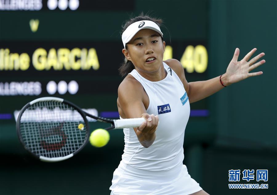 7月1日,张帅在比赛中回球。 当日,在英国伦敦举行的2019温布尔登网球公开赛女单第一轮比赛中,中国选手张帅以2比0战胜法国选手加西亚,进入下一轮。 新华社记者韩岩摄