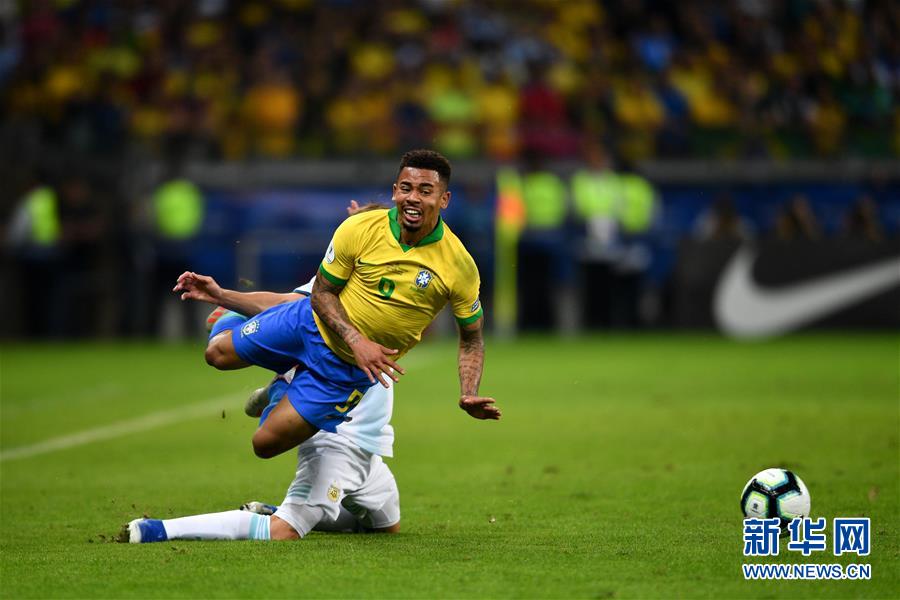 7月2日,巴西队球员热苏斯(前)在比赛中。 当日,在巴西贝洛奥里藏特举行的美洲杯半决赛中,巴西队以2比0淘汰阿根廷队,晋级决赛。 新华社记者 辛悦卫 摄
