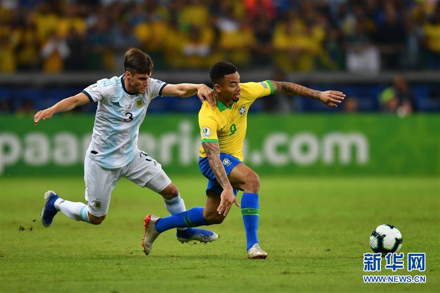 7月2日,阿根廷队球员塔利亚菲戈(左)和巴西队球员热苏斯在比赛中拼抢。 当日,在巴西贝洛奥里藏特举行的美洲杯半决赛中,巴西队以2比0淘汰阿根廷队,晋级决赛。 新华社记者 辛悦卫 摄