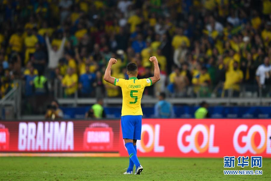 7月2日,巴西队球员卡塞米罗在比赛后庆祝胜利。 当日,在巴西贝洛奥里藏特举行的美洲杯半决赛中,巴西队以2比0淘汰阿根廷队,晋级决赛。 新华社记者 辛悦卫 摄