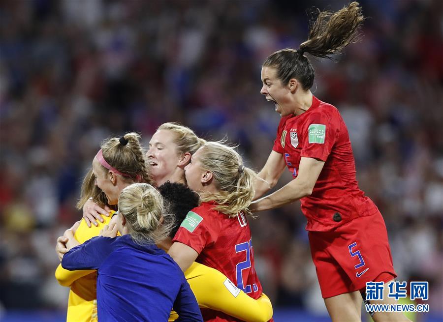 7月2日,美国队在获胜后庆祝。 当日,在法国里昂举行的2019年国际足联女足世界杯半决赛中,美国队以2比1战胜英格兰队,晋级决赛。 新华社记者 丁旭 摄
