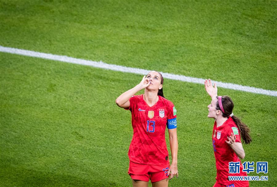 7月2日,美国队球员摩根(左)在进球后与队友庆祝。 当日,在法国里昂举行的2019年国际足联女足世界杯半决赛中,美国队以2比1战胜英格兰队,晋级决赛。 新华社记者 肖艺九 摄