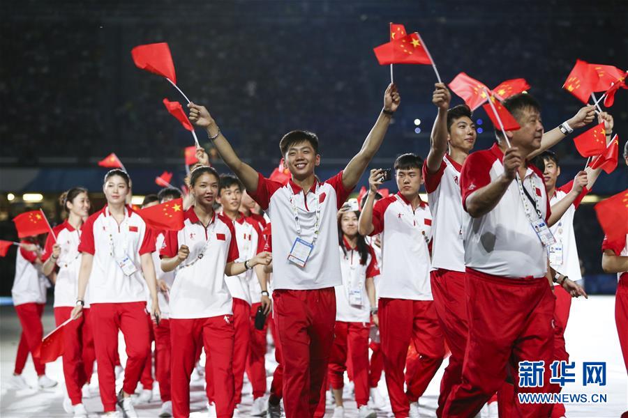 7月3日,中国大学生体育代表团在开幕式上入场。新华社记者郑焕松摄