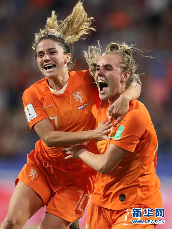 7月3日,荷兰队球员范德东克(左)与荷兰队球员罗德在比赛中庆祝队友格勒嫩射门得分。 当日,在法国里昂举行的2019年国际足联女足世界杯半决赛中,荷兰队在加时赛中攻入一球,以1比0战胜瑞典队,晋级决赛。 新华社记者徐子鉴摄