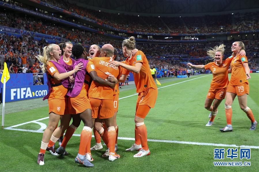 7月3日,荷兰队球员格勒嫩(左四)进球后与队友庆祝。 当日,在法国里昂举行的2019年国际足联女足世界杯半决赛中,荷兰队在加时赛中攻入一球,以1比0战胜瑞典队,晋级决赛。 新华社记者徐子鉴摄