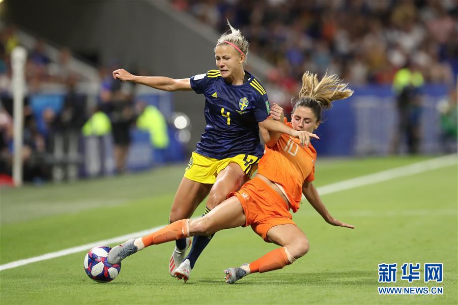7月3日,荷兰队球员范德东克(右)与瑞典队球员格拉斯在比赛中拼抢。 当日,在法国里昂举行的2019年国际足联女足世界杯半决赛中,荷兰队在加时赛中攻入一球,以1比0战胜瑞典队,晋级决赛。 新华社记者徐子鉴摄