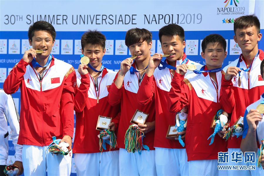 7月8日,中国队选手刘成铭、黄博文、曹李智、胡子杰、黄子淦、李平安(从左至右)在男子团体颁奖仪式上。 当日,第30届世界大学生夏季运动会跳水项目全部比赛在意大利那不勒斯结束,中国队获得男子、女子团体金牌。 新华社记者郑焕松摄