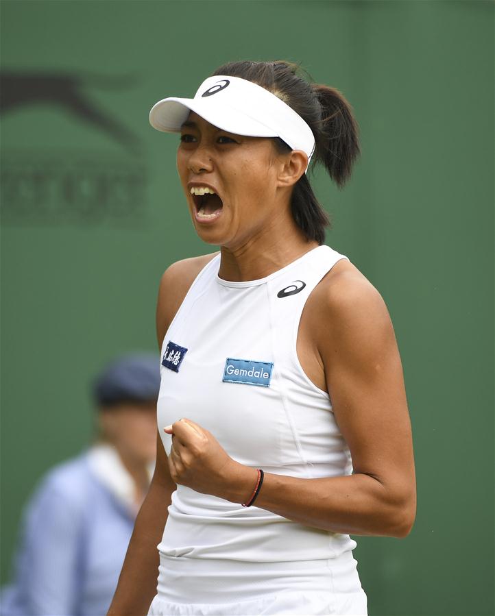 7月8日,中国选手张帅在赢得第一盘后庆祝。 当日,在英国伦敦举行的2019温布尔登网球公开赛女单第四轮比赛中,中国选手张帅以2比1战胜乌克兰选手达亚娜,晋级八强。 新华社记者逯阳摄