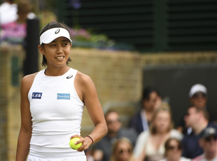7月8日,中国选手张帅在比赛中。 当日,在英国伦敦举行的2019温布尔登网球公开赛女单第四轮比赛中,中国选手张帅以2比1战胜乌克兰选手达亚娜,晋级八强。 新华社记者逯阳摄
