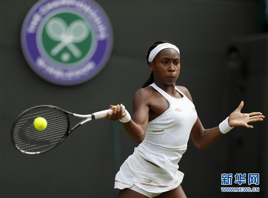 7月8日,高夫在比赛中回球。 当日,在英国伦敦举行的2019温布尔登网球公开赛女单第四轮比赛中,温网近半个世纪以来最年轻的职业选手、15岁的美国选手高夫以0比2不敌罗马尼亚选手哈勒普,无缘再续“神话”。 新华社记者韩岩摄