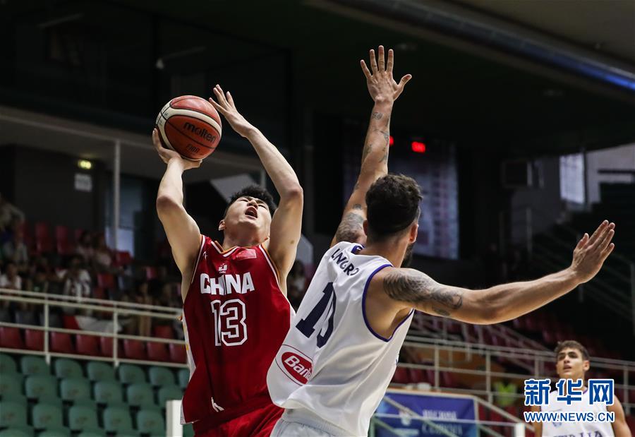 7月8日,中国队球员赵柏清(左)在意大利队球员隆戈巴尔迪的防守下投篮。 当日,在意大利那不勒斯举行的第30届世界大学生夏季运动会男子篮球9至16名排位赛中,中国队以83比95不敌意大利队。 新华社记者单宇琦摄