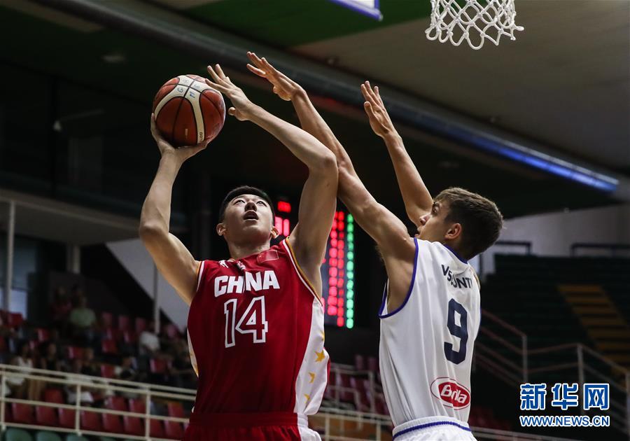 7月8日,中国队球员王少杰(左)在意大利队球员维斯孔蒂的防守下上篮。 当日,在意大利那不勒斯举行的第30届世界大学生夏季运动会男子篮球9至16名排位赛中,中国队以83比95不敌意大利队。 新华社记者单宇琦摄