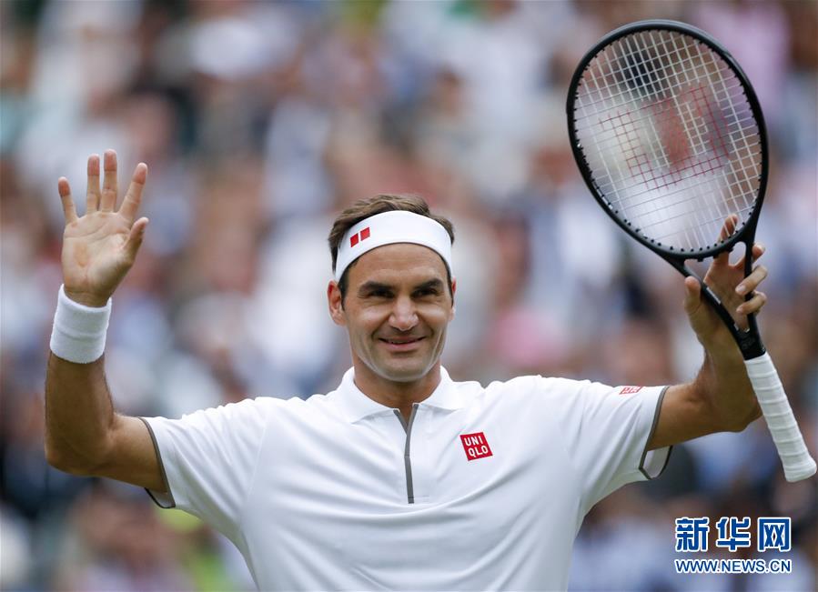 7月8日,费德勒在获胜后庆祝。 当日,在英国伦敦举行的2019温布尔登网球公开赛男单第四轮比赛中,瑞士选手费德勒以3比0战胜意大利选手贝雷蒂尼,晋级八强。 新华社记者韩岩摄