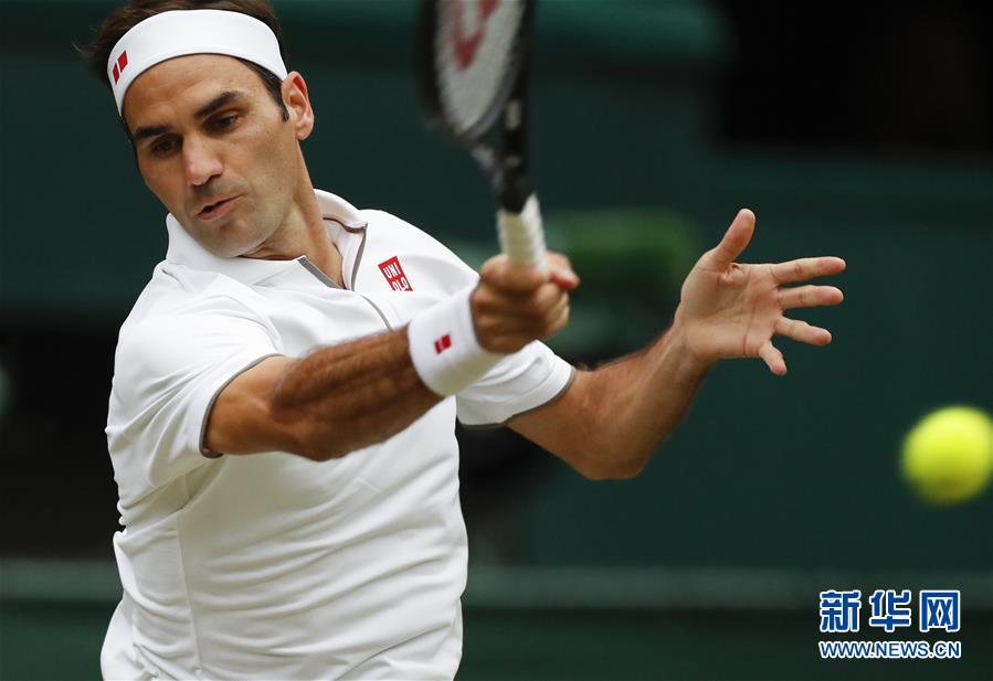 7月8日,费德勒在比赛中回球。 当日,在英国伦敦举行的2019温布尔登网球公开赛男单第四轮比赛中,瑞士选手费德勒以3比0战胜意大利选手贝雷蒂尼,晋级八强。 新华社记者韩岩摄