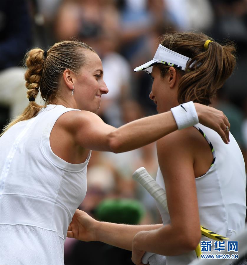 7月8日,科维托娃(左)在比赛后向孔塔表示祝贺。 当日,在英国伦敦举行的2019温布尔登网球公开赛女单第四轮比赛中,捷克选手科维托娃以1比2不敌英国选手孔塔,无缘八强。 新华社记者逯阳摄