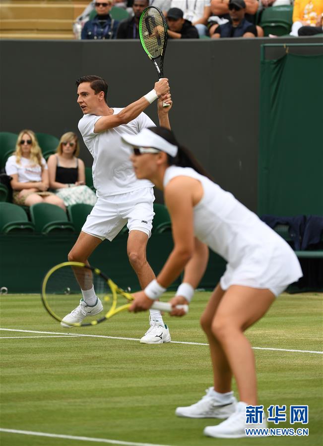 7月9日,弗利根(左)/郑赛赛在比赛中。 当日,在英国伦敦举行的2019温布尔登网球公开赛混双第三轮比赛中,弗利根(比利时)/郑赛赛(中国)以1比2不敌英国组合霍伊特/席尔瓦,无缘八强。 新华社记者逯阳摄