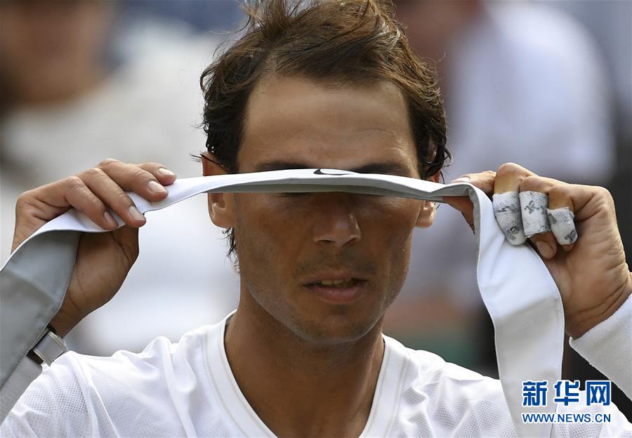 7月10日,纳达尔在比赛间隙戴头巾。 当日,在英国伦敦举行的2019温布尔登网球公开赛男单四分之一决赛中,西班牙选手纳达尔以3比0战胜美国选手奎里,晋级半决赛。 新华社记者逯阳摄