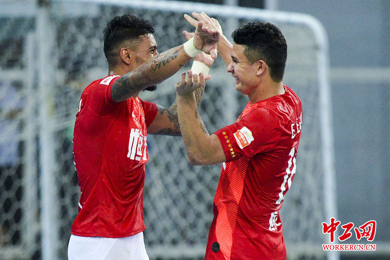 2019年7月11日,天津市,2019中超第17轮,天津泰达Vs广州恒大淘宝。保利尼奥与埃尔克森庆祝进球。(来源:视觉中国)